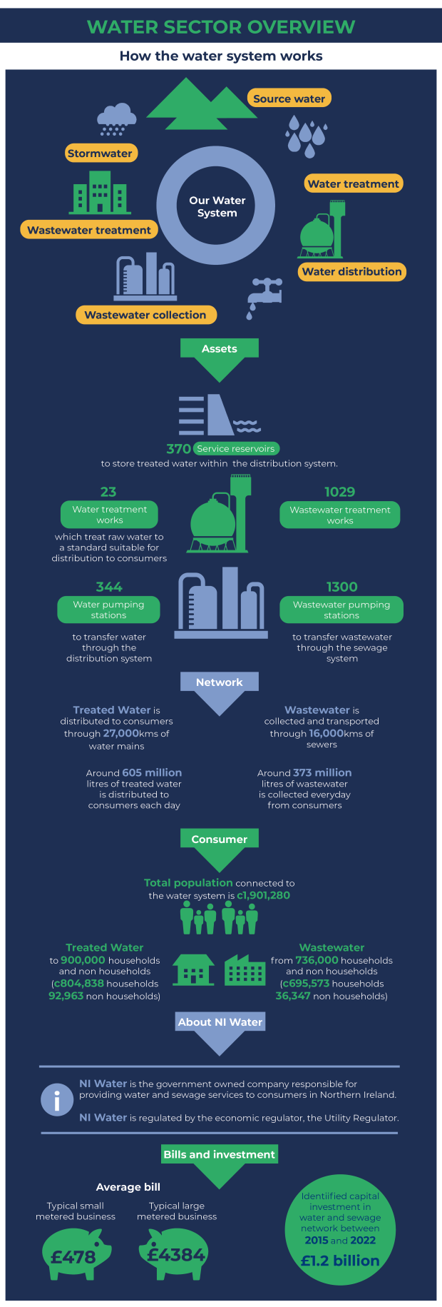 We regulate Northern Ireland Water (NI Water), which provides water and sewerage services to the 655,000 households and 85,000 non-households across Northern Ireland. NI Water has dual status as a government-owned company and a non-departmental public body. It operates according to conditions outlined in its licence.